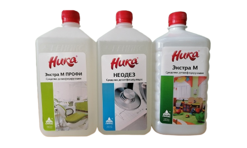 Ника Экстра М — жидкость, предназначенная для дезинфекции и мытья поверхностей в помещениях, посуды, жесткой мебели, белья, предметов ухода за больными, уборочного инвентаря. Фасовка 1 л, 5 л.